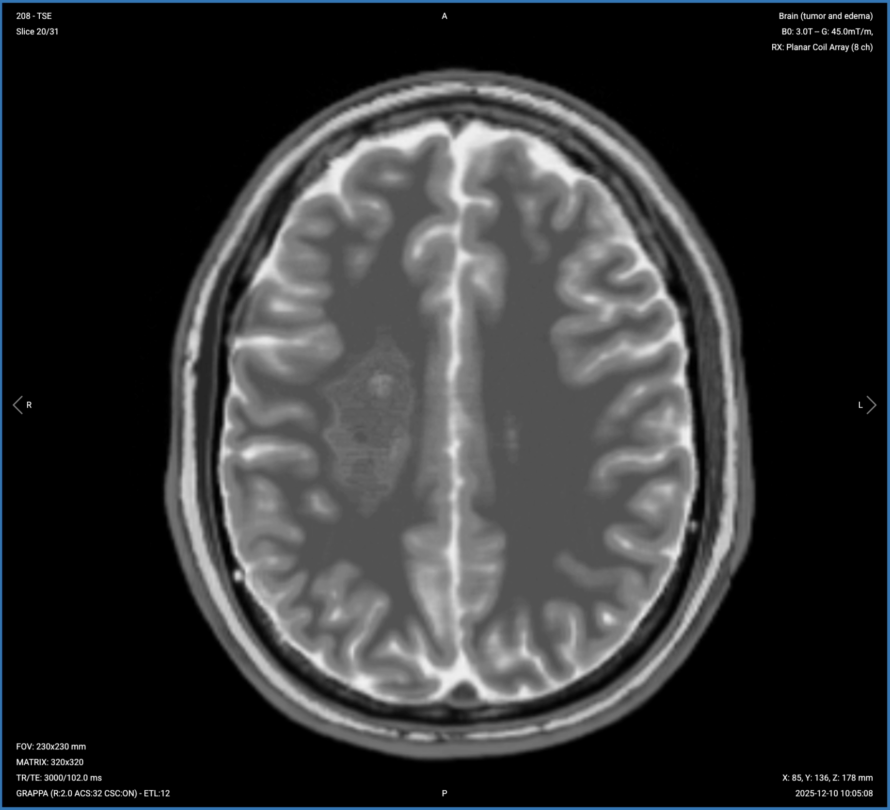 In brain tumor imaging, pre-contrast T1 3D MP-RAGE serves as the baseline for anatomical assessment. It helps us identify the tumor's location, morphology, and any intrinsic T1 hyperintensity such as hemorrhage, melanin, fat, or protein. It also shows mass effect and structural distortion caused by the tumor, including ventricular compression or midline shift. The thin 1 mm slices enable multiplanar reconstructions in any plane for detailed surgical planning.